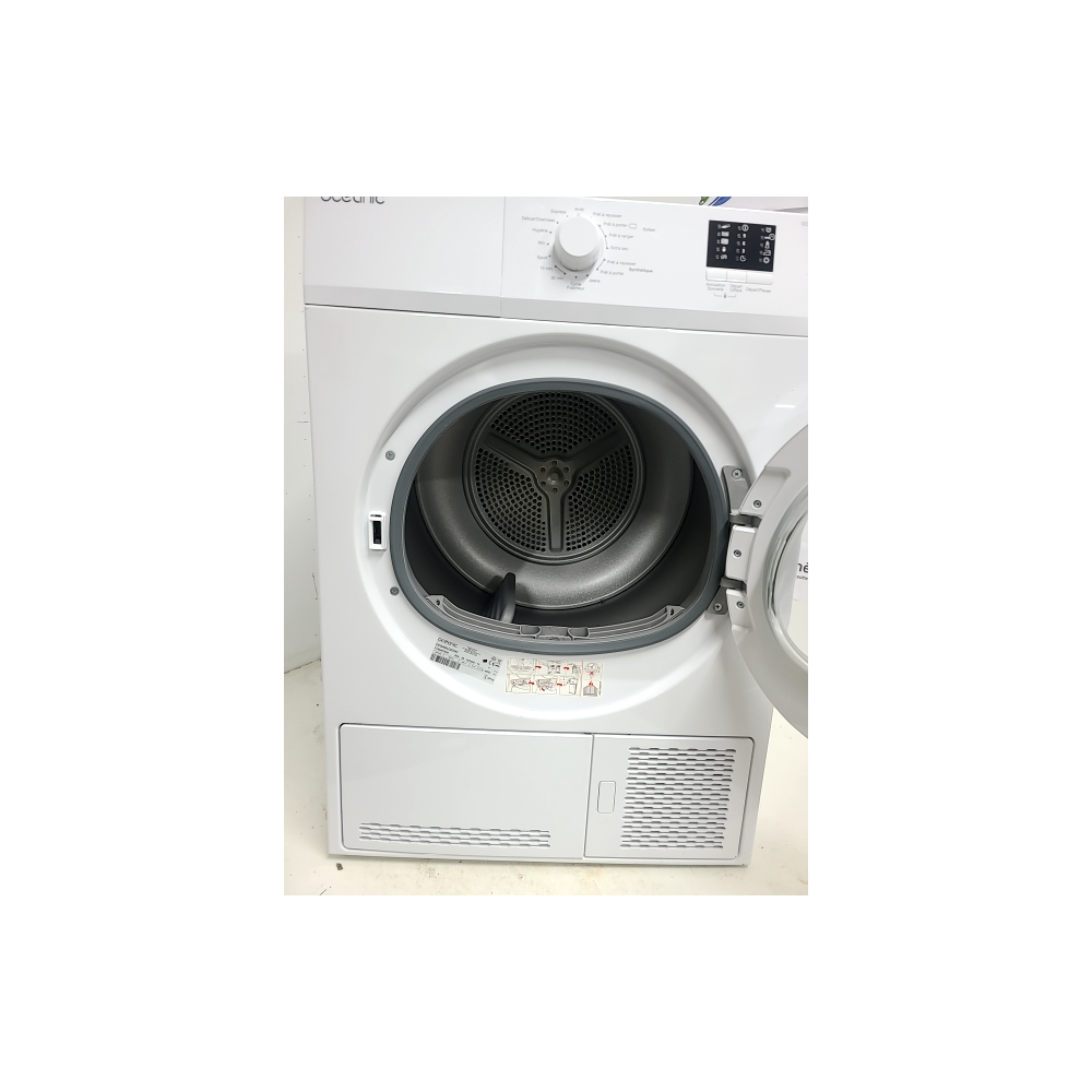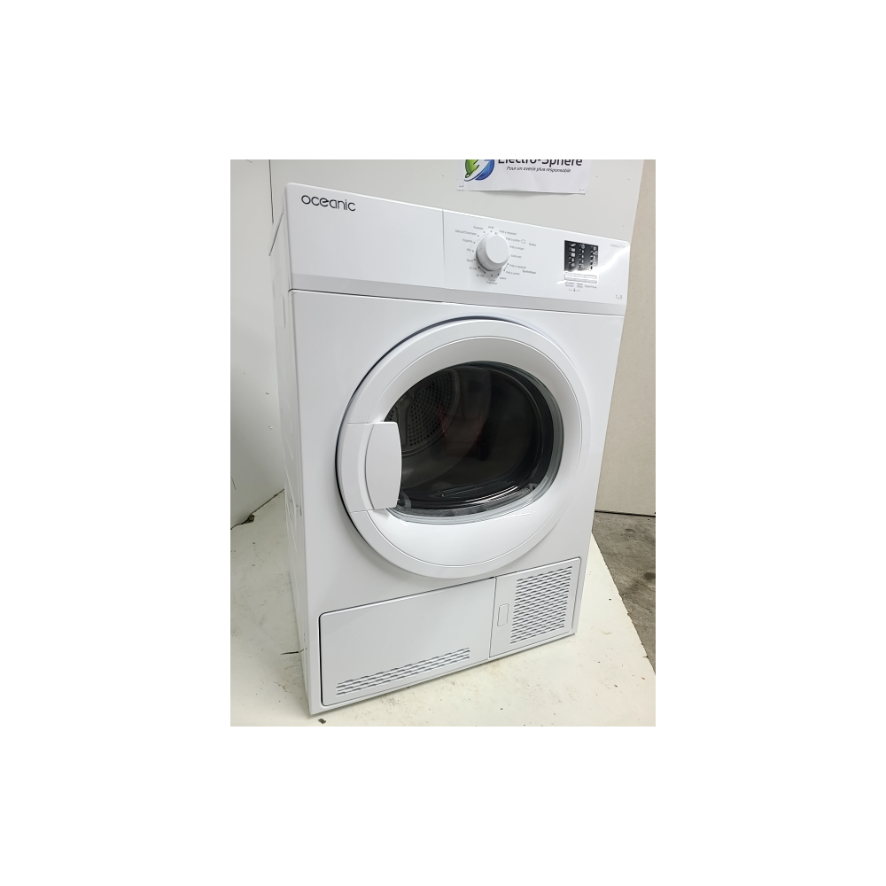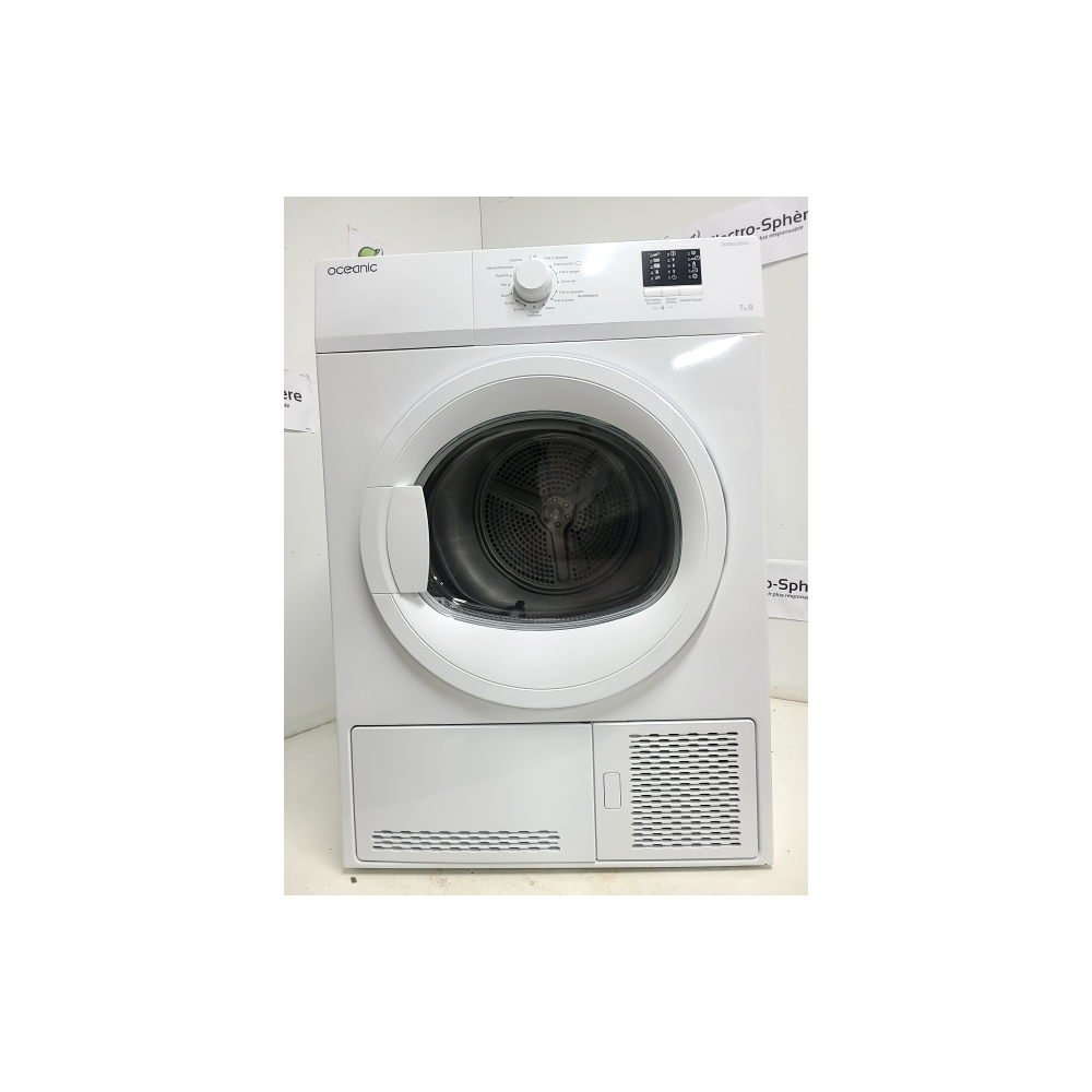 Sèche-linge à condensation Oceanic OCEASLCE7W1 avec capacité de 7 kg, idéal pour un usage domestique, offrant un séchage efficace du linge en coton avec une classe énergétique B.