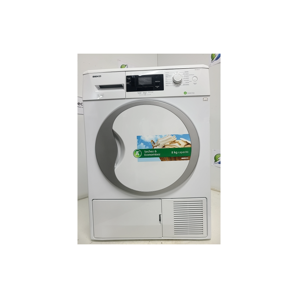 Sèche-linge Beko DPU 8341 X à condensation avec pompe à chaleur, capacité 8 kg, classe énergétique A+, équipé d'un écran LCD, sonde électronique, et départ différé jusqu'à 24h.